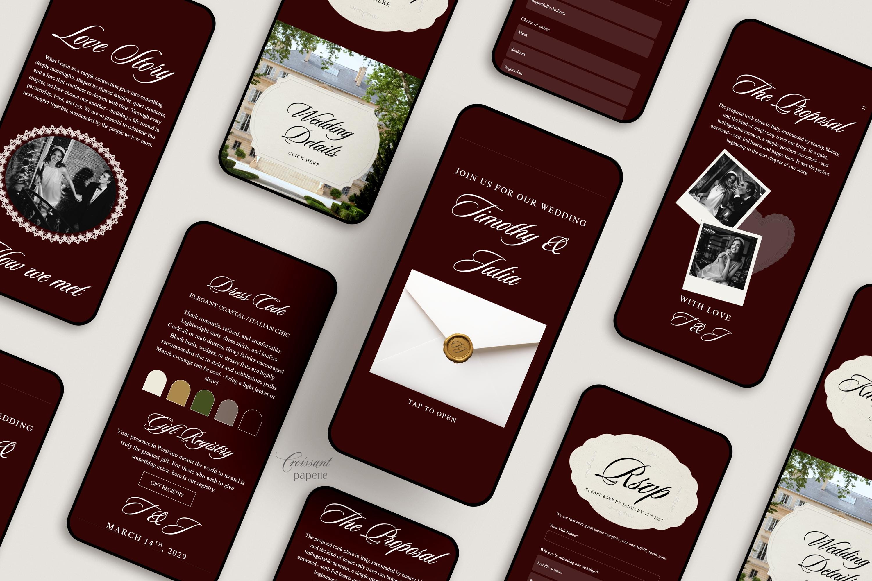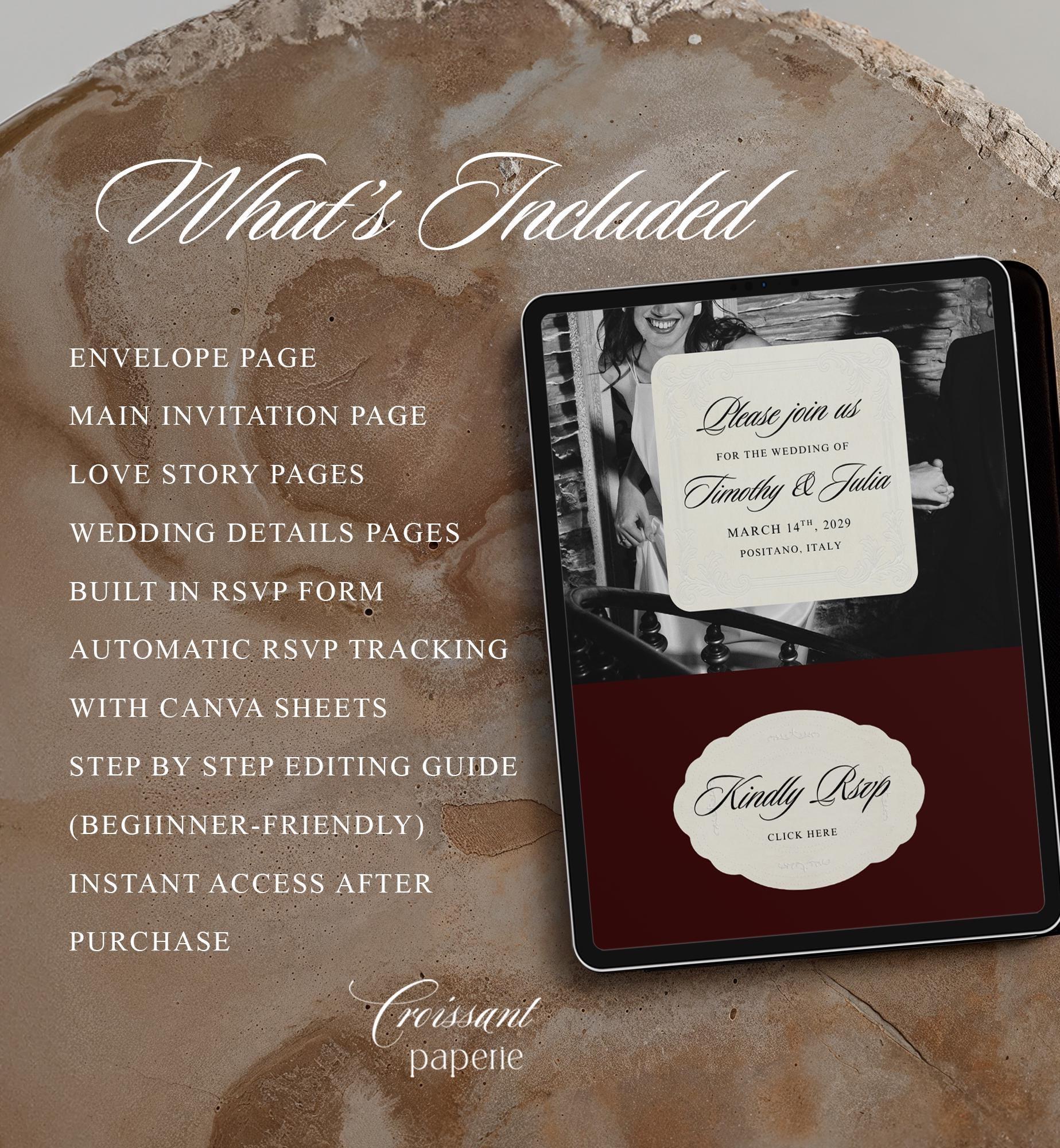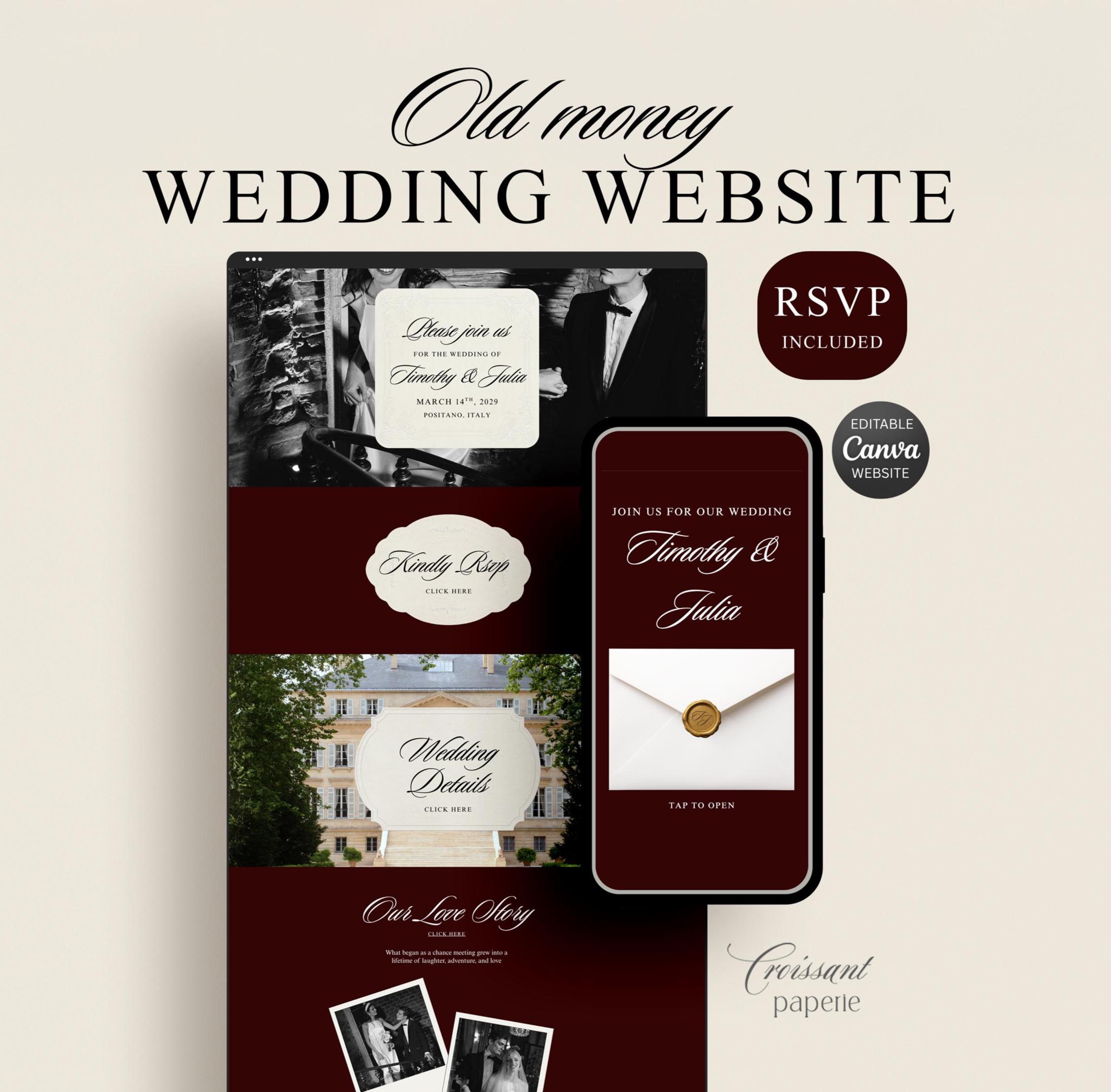 Wedding Website Template with RSVP, Burgundy & Cream Custom Editable Canva Design, Old Money Classic Digital Invitation (Digital Download)