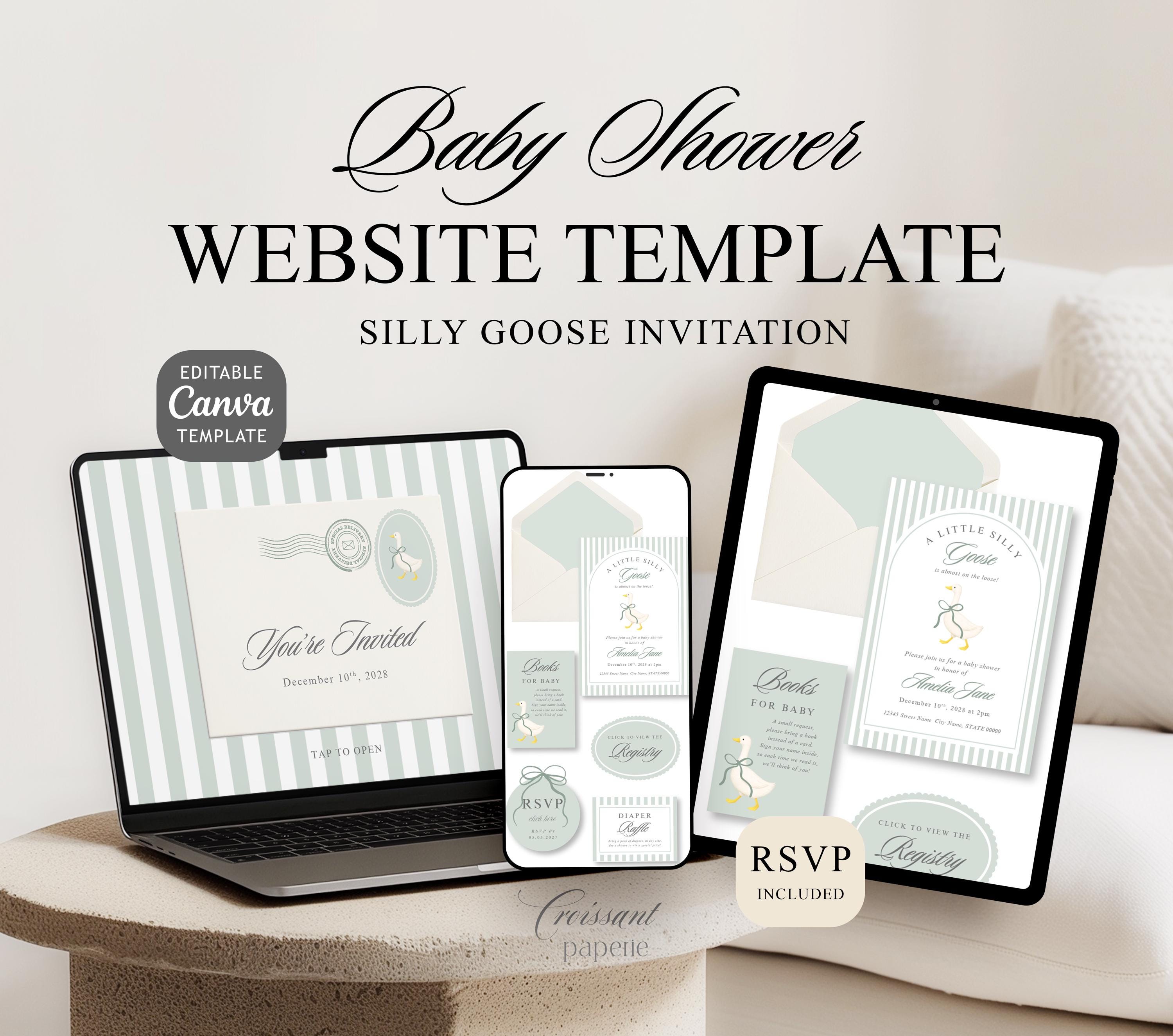 Silly Goose Baby Shower Website Template with RSVP, Editable Canva Website, Silly Goose on the Loose Digital Invitation Neutral Cottage