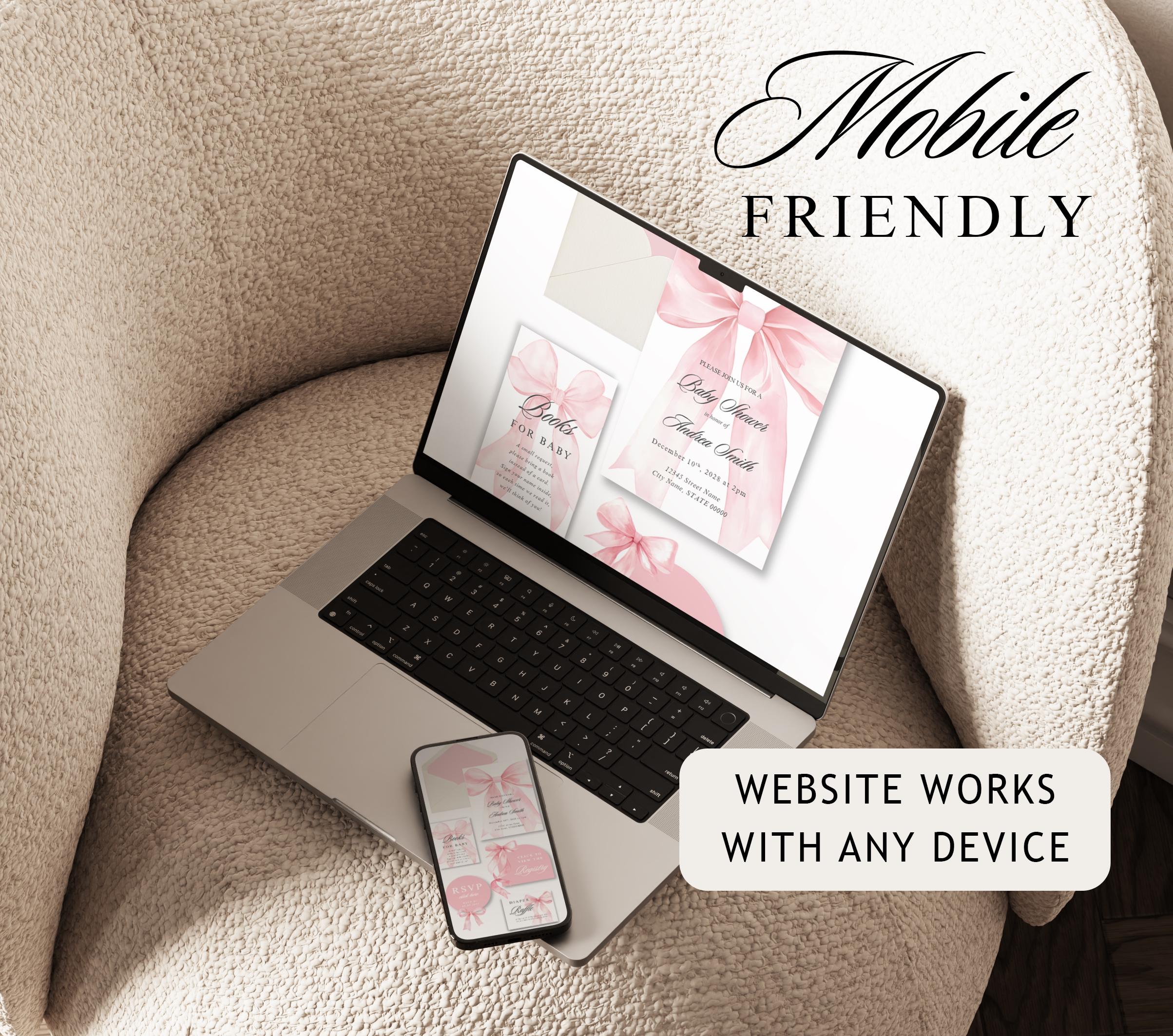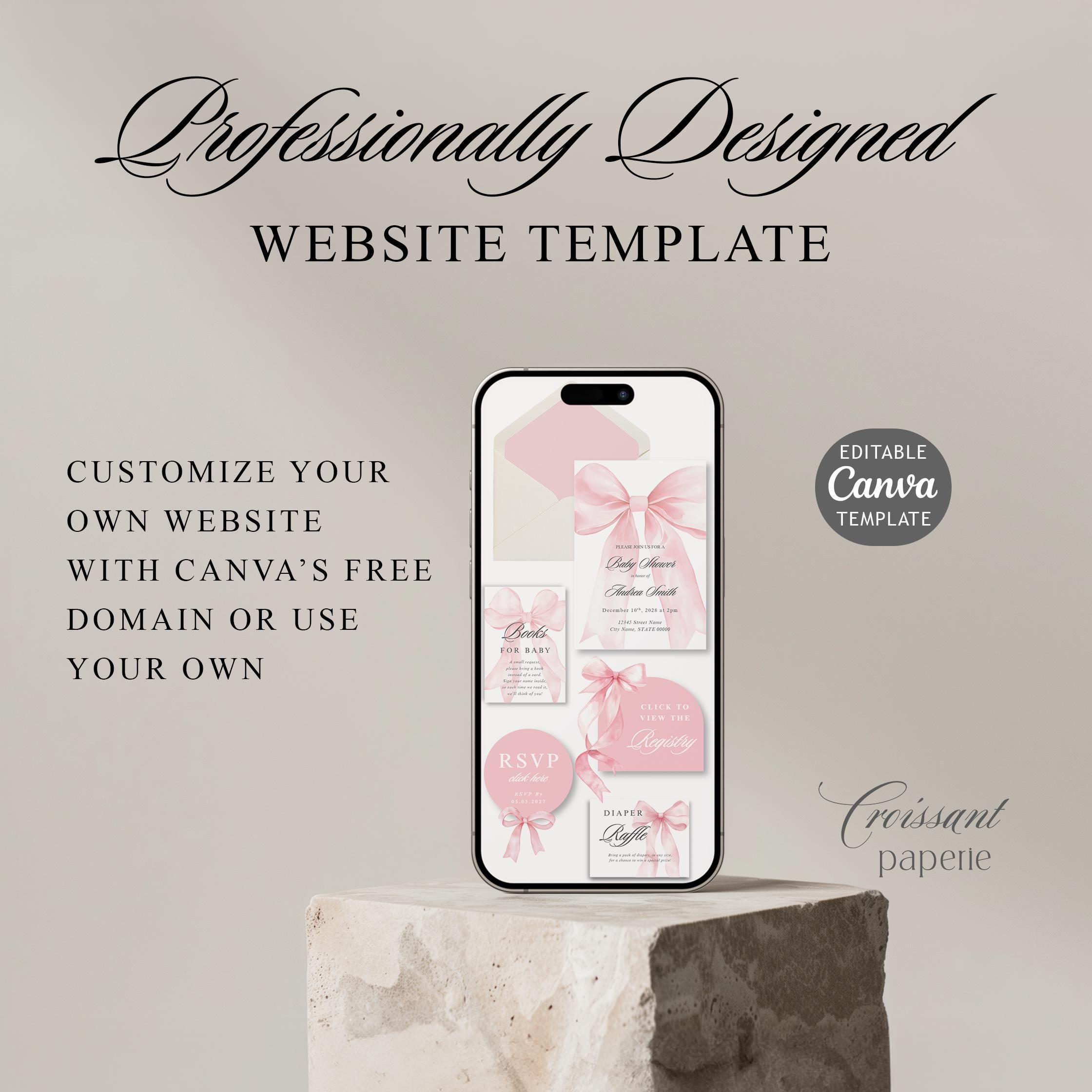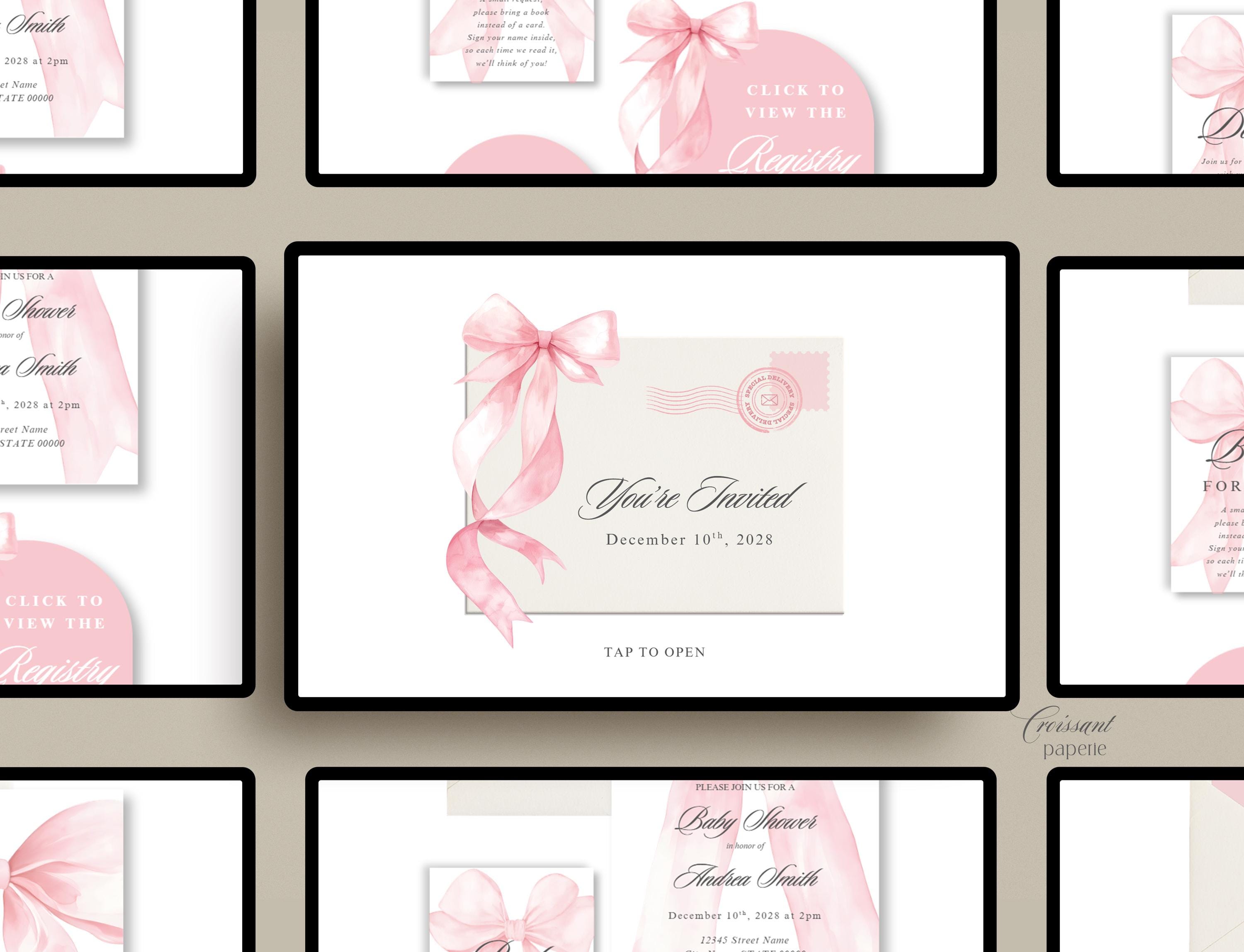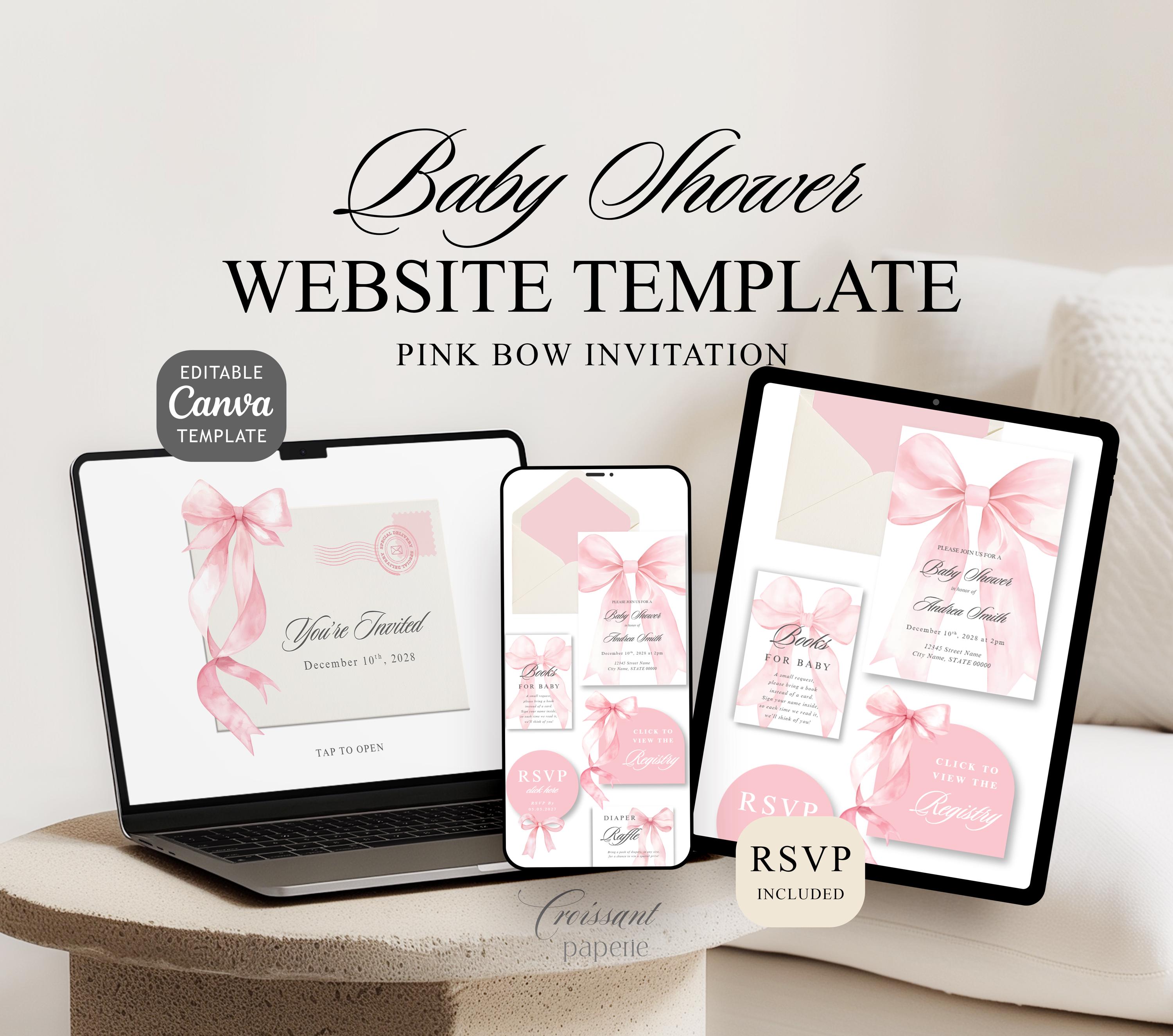 Pink Bow Baby Shower Website Template with RSVP, Editable Canva Website, Pink Bow Digital Invitation Pink Ribbon Coquette Girl Baby Shower