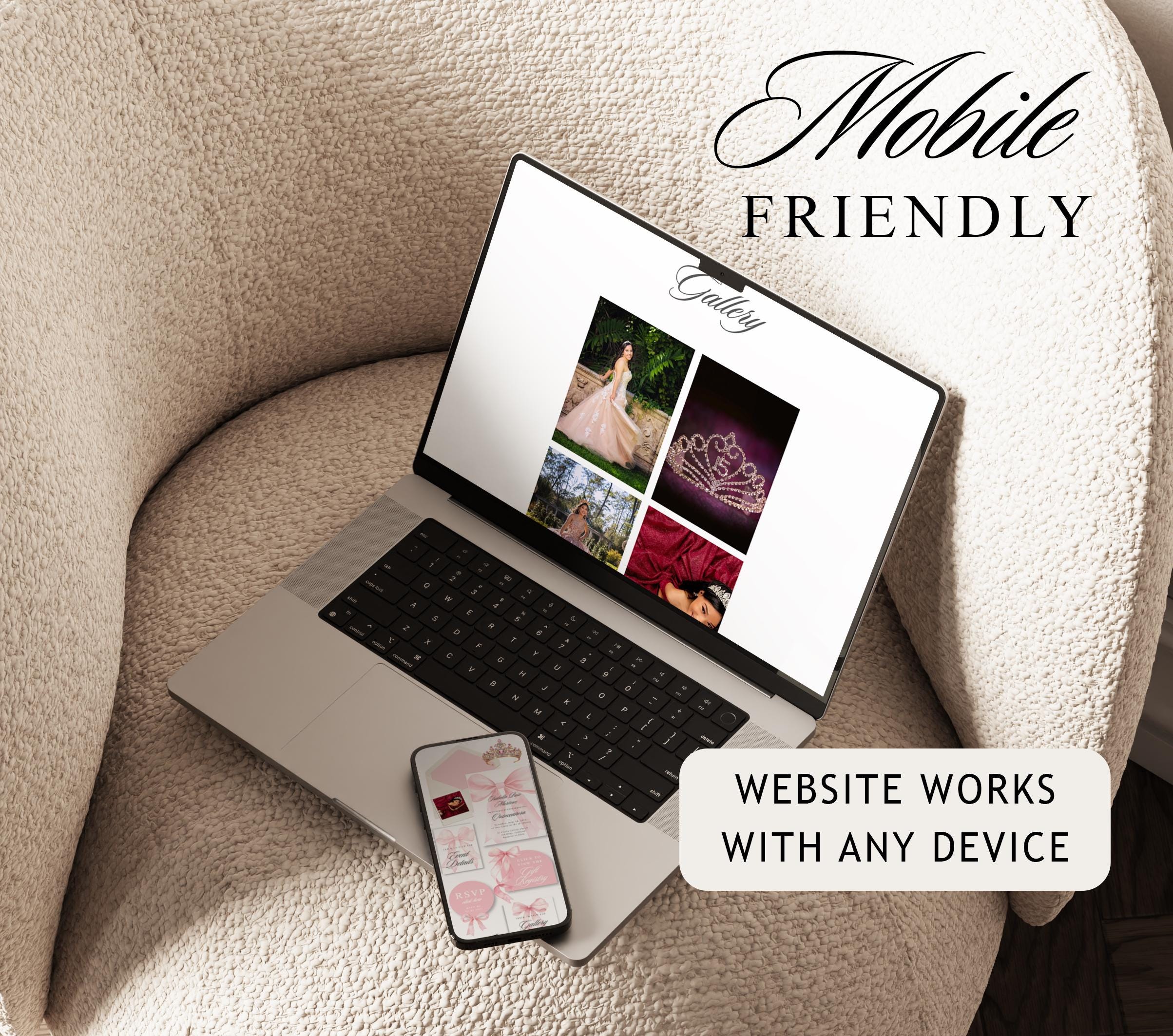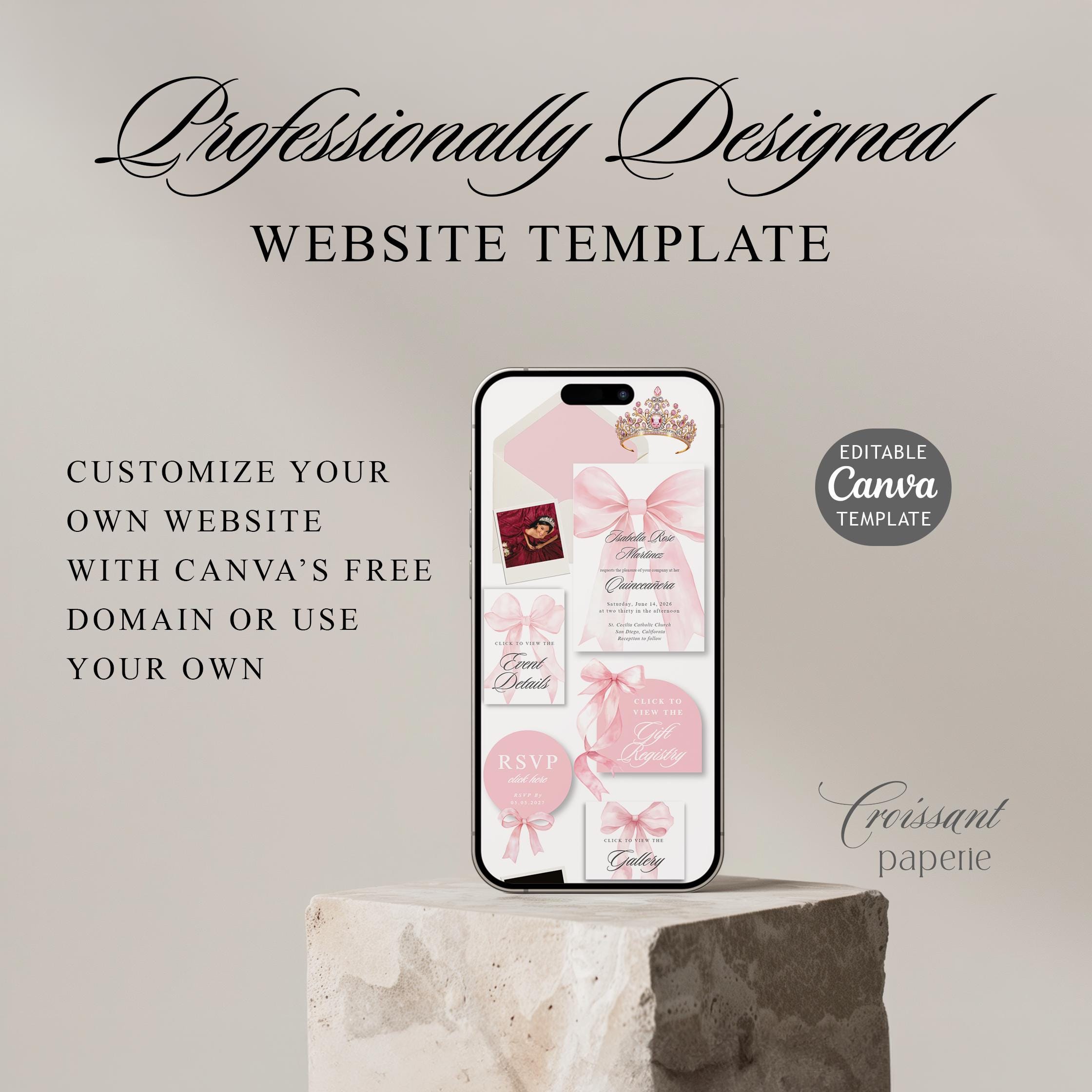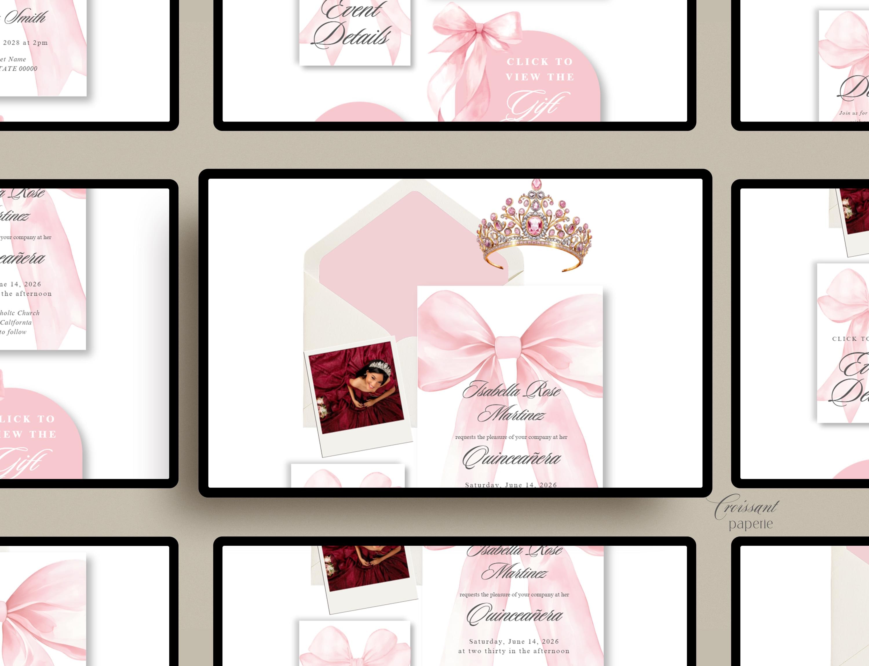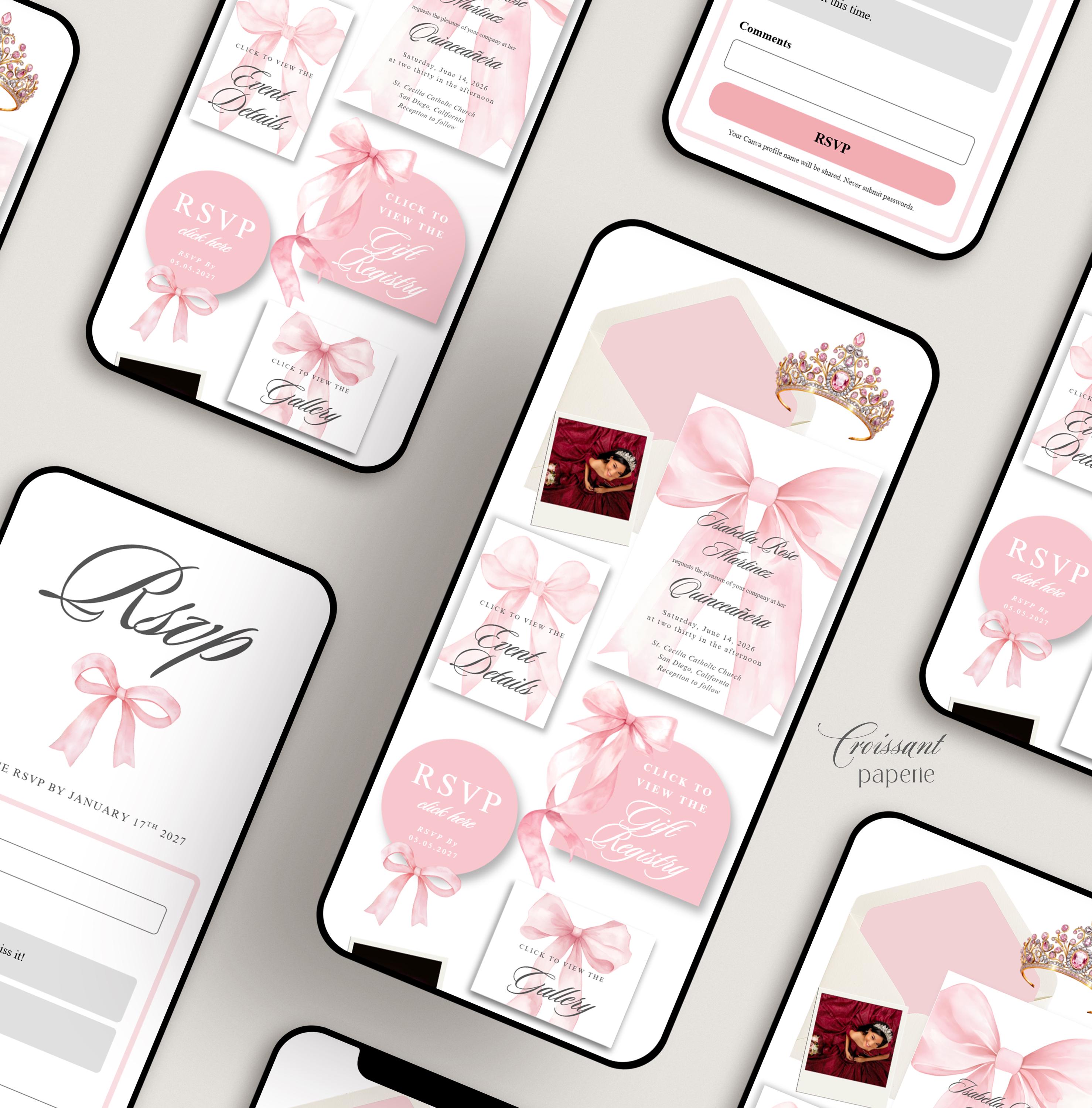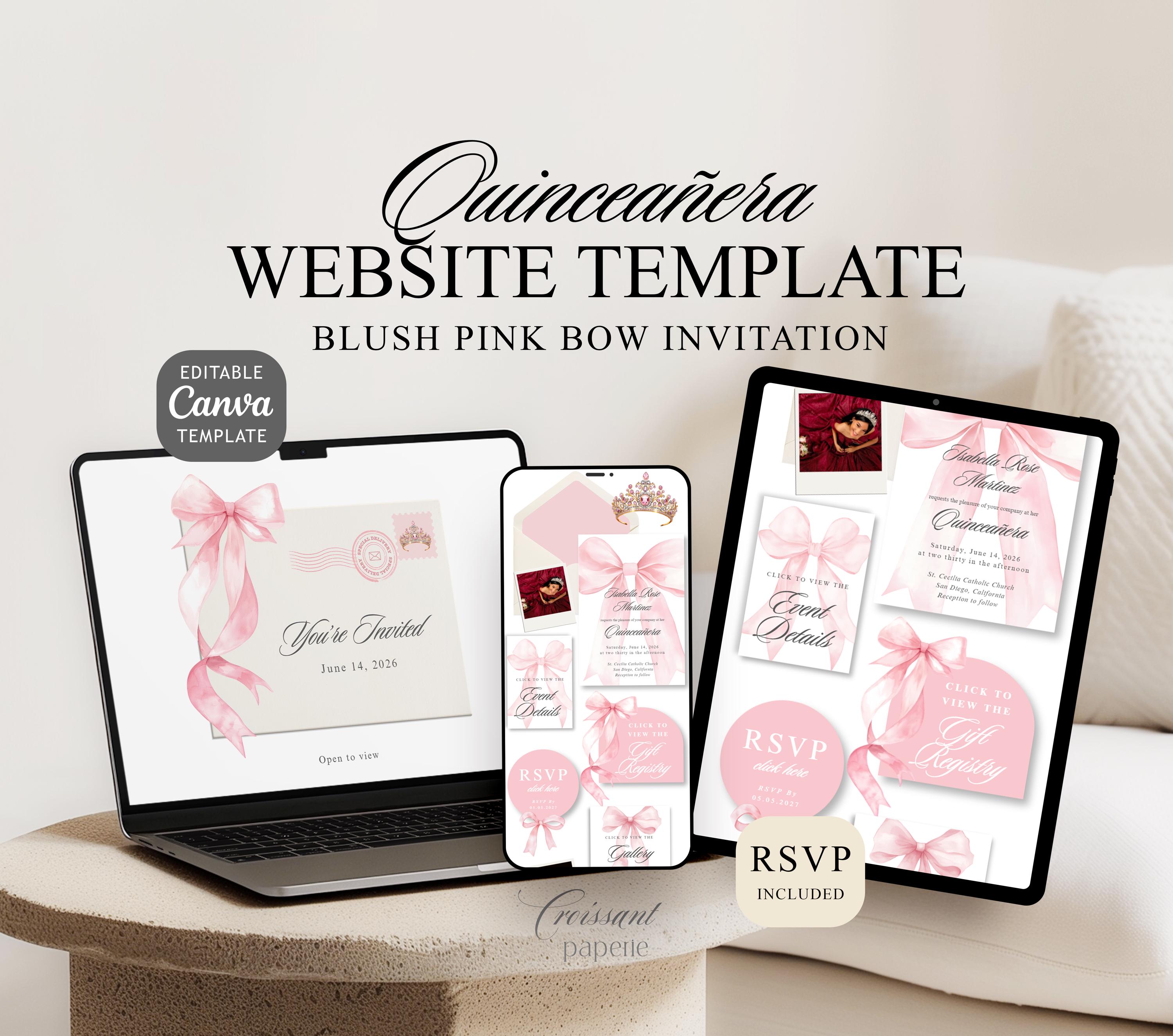 Blush Pink Quinceanera Digital Invitation Website Template with RSVP, Editable Canva Website, Pink Bow 15th Birthday Digital Invitation Pink