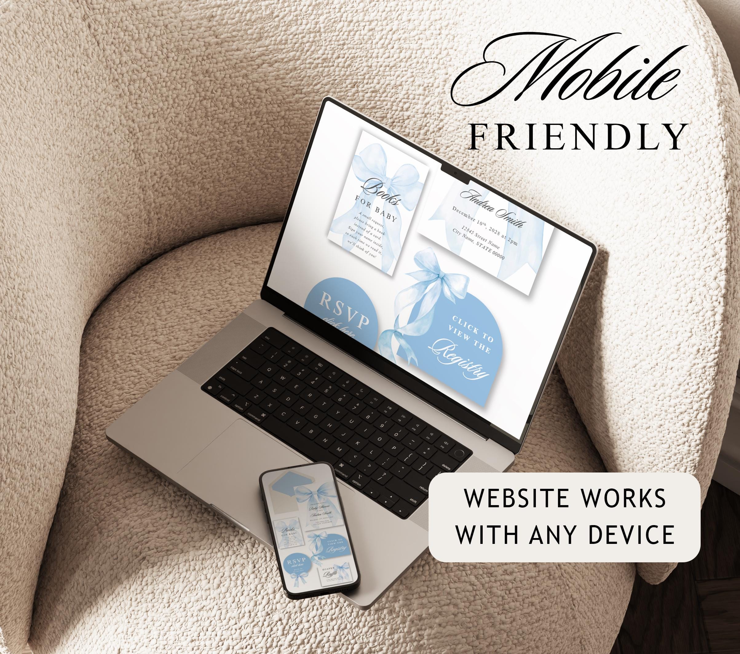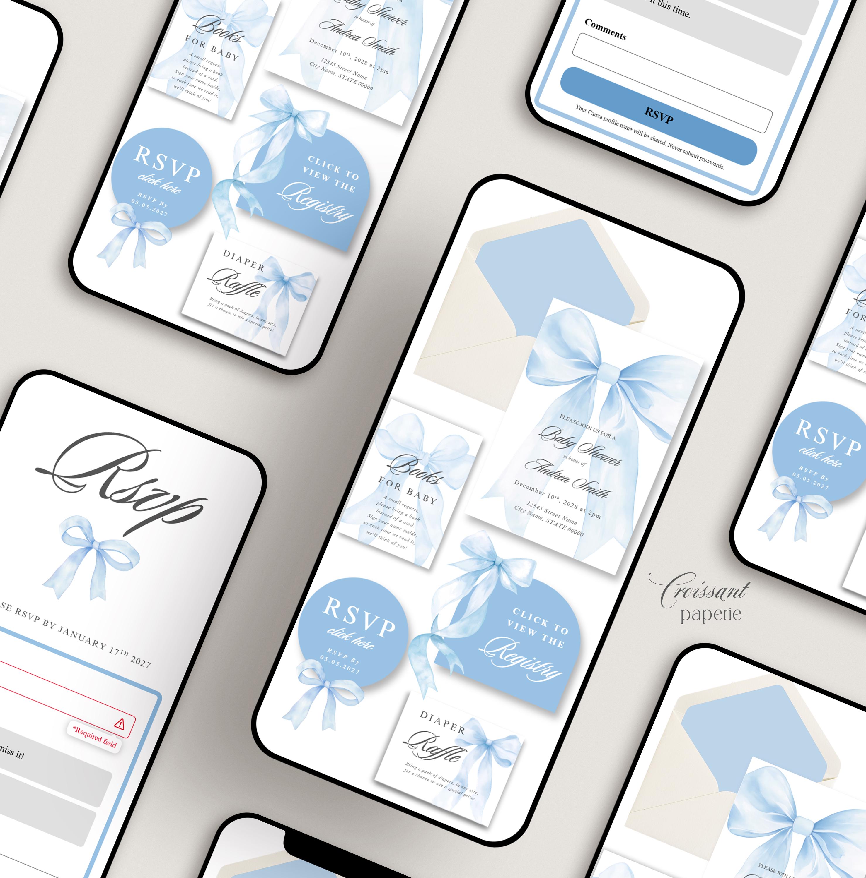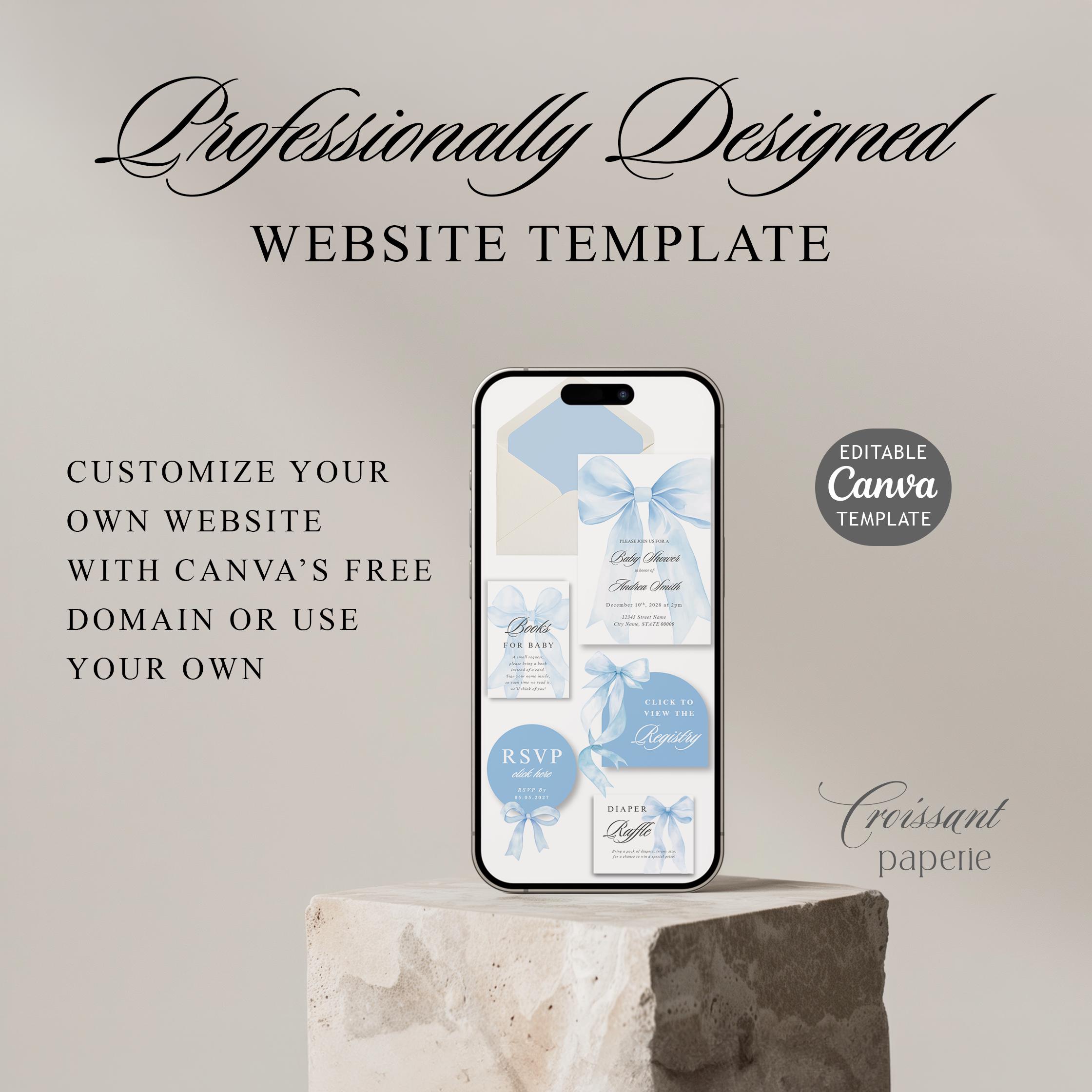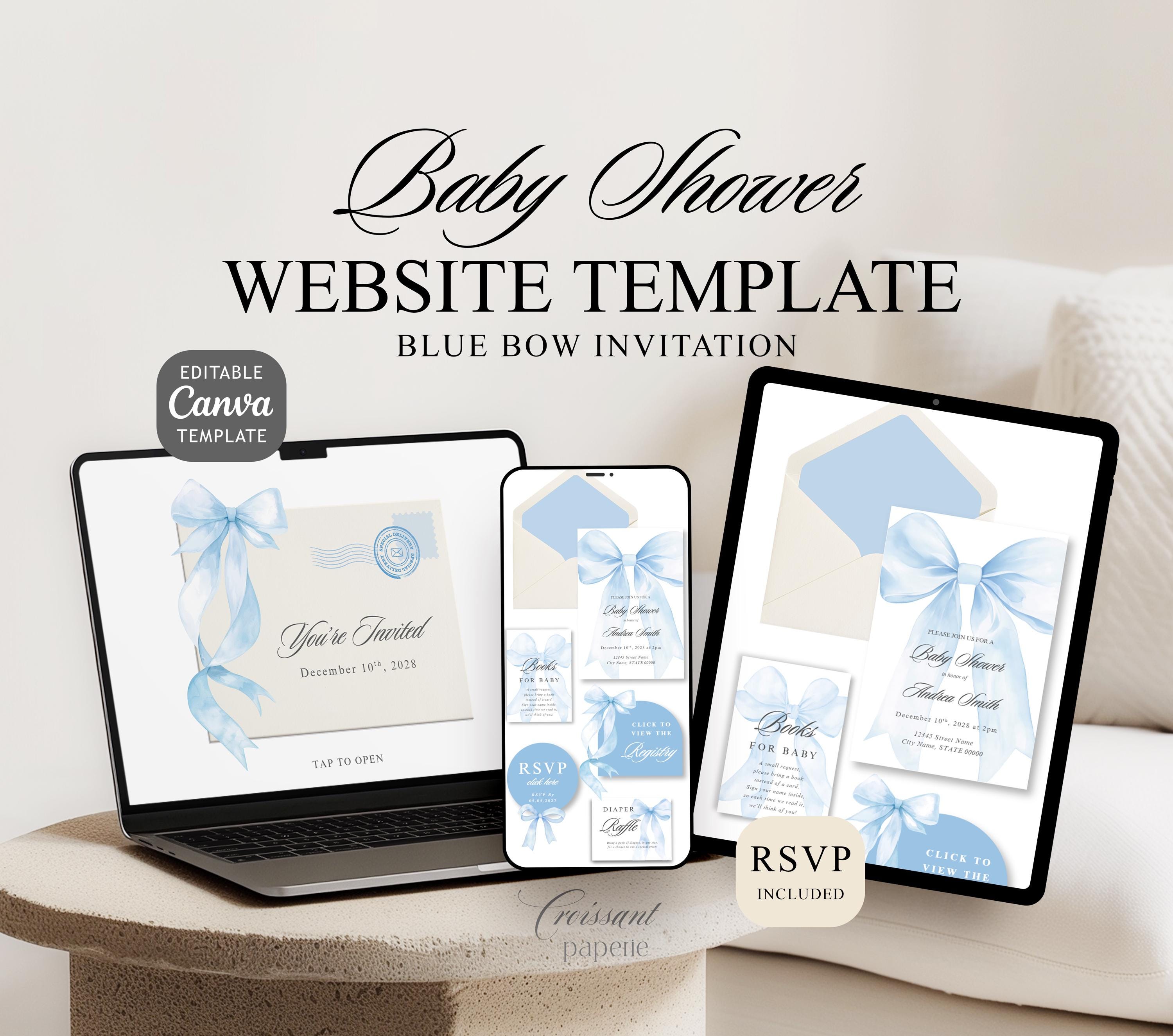 Blue Bow Boy Baby Shower Website Template with RSVP, Editable Canva Website, Blue Bow Digital Invitation Blue Ribbon Boy Baby Shower