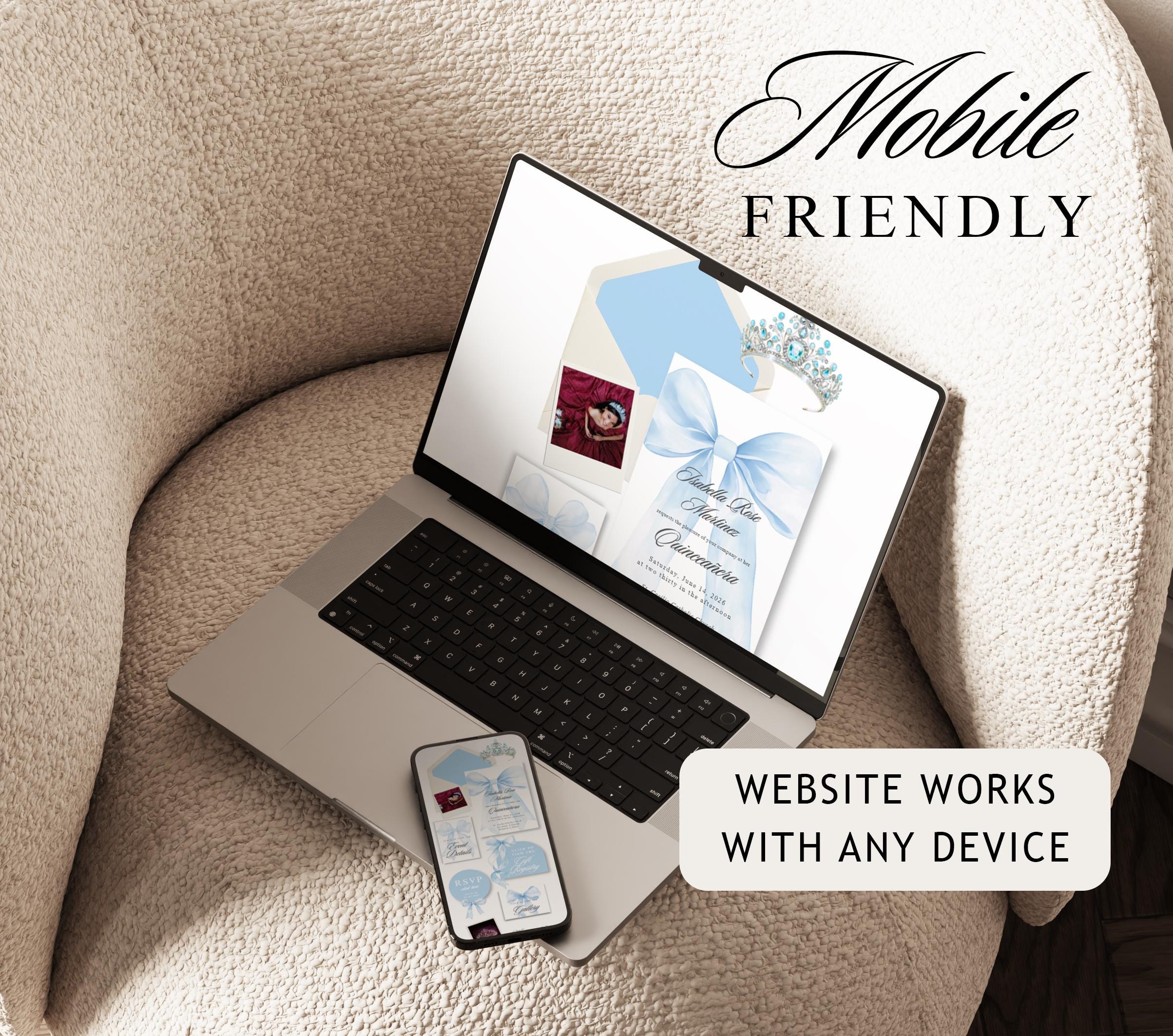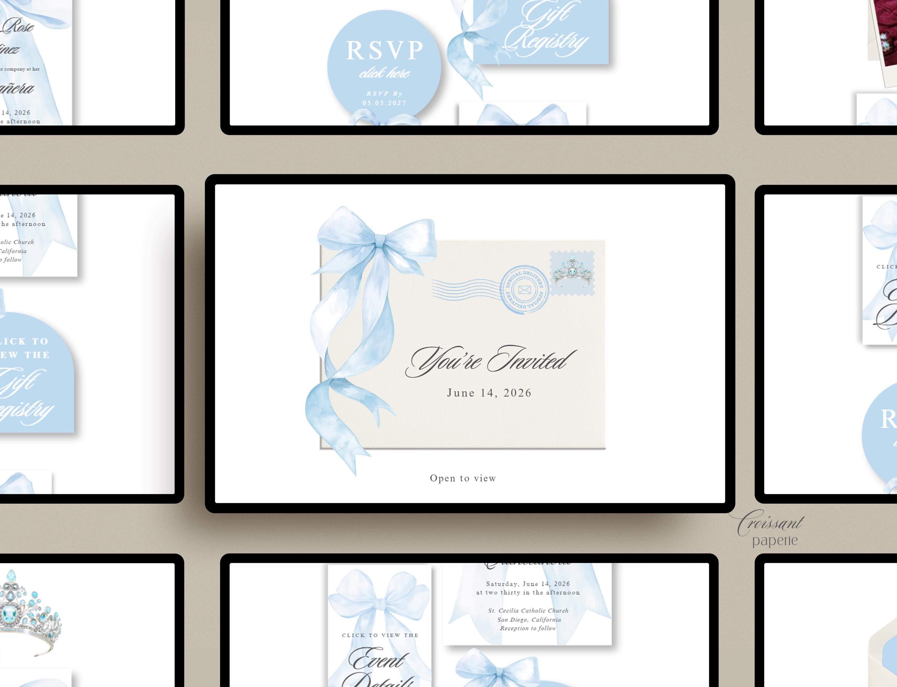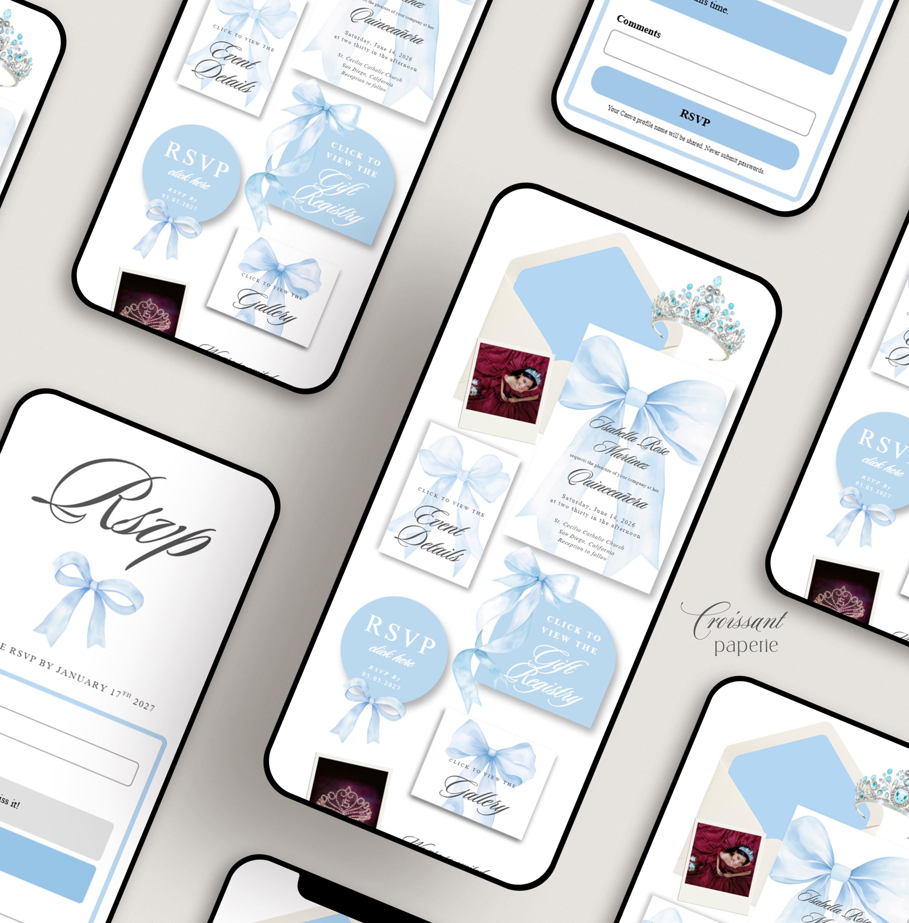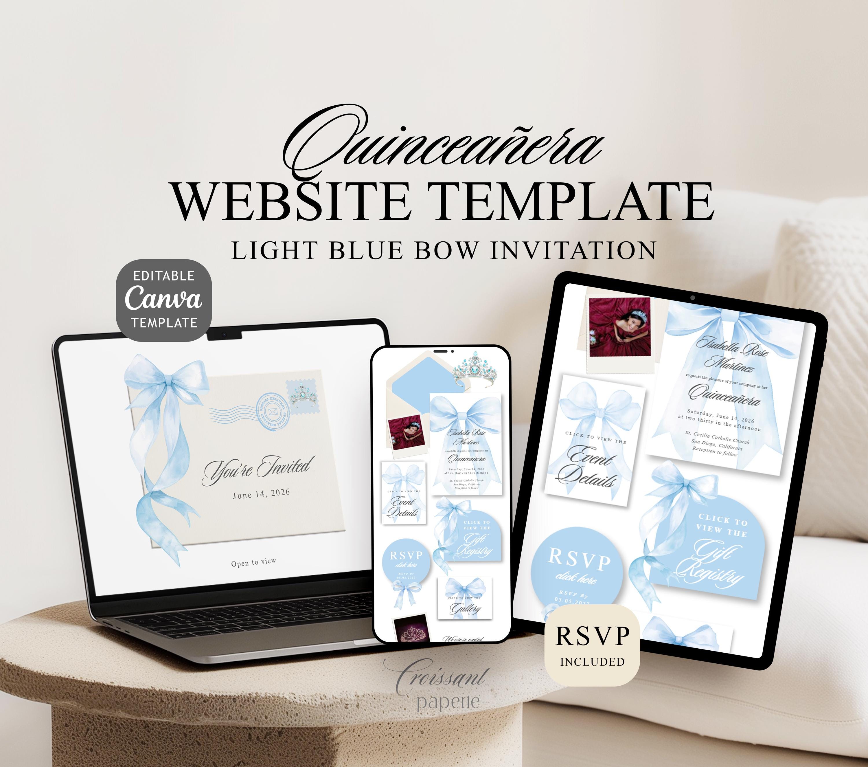 Baby Light Blue Quinceanera Digital Invitation Website Template with RSVP, Editable Canva Website, Blue Bow 15th Birthday Digital Invitation Blue