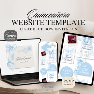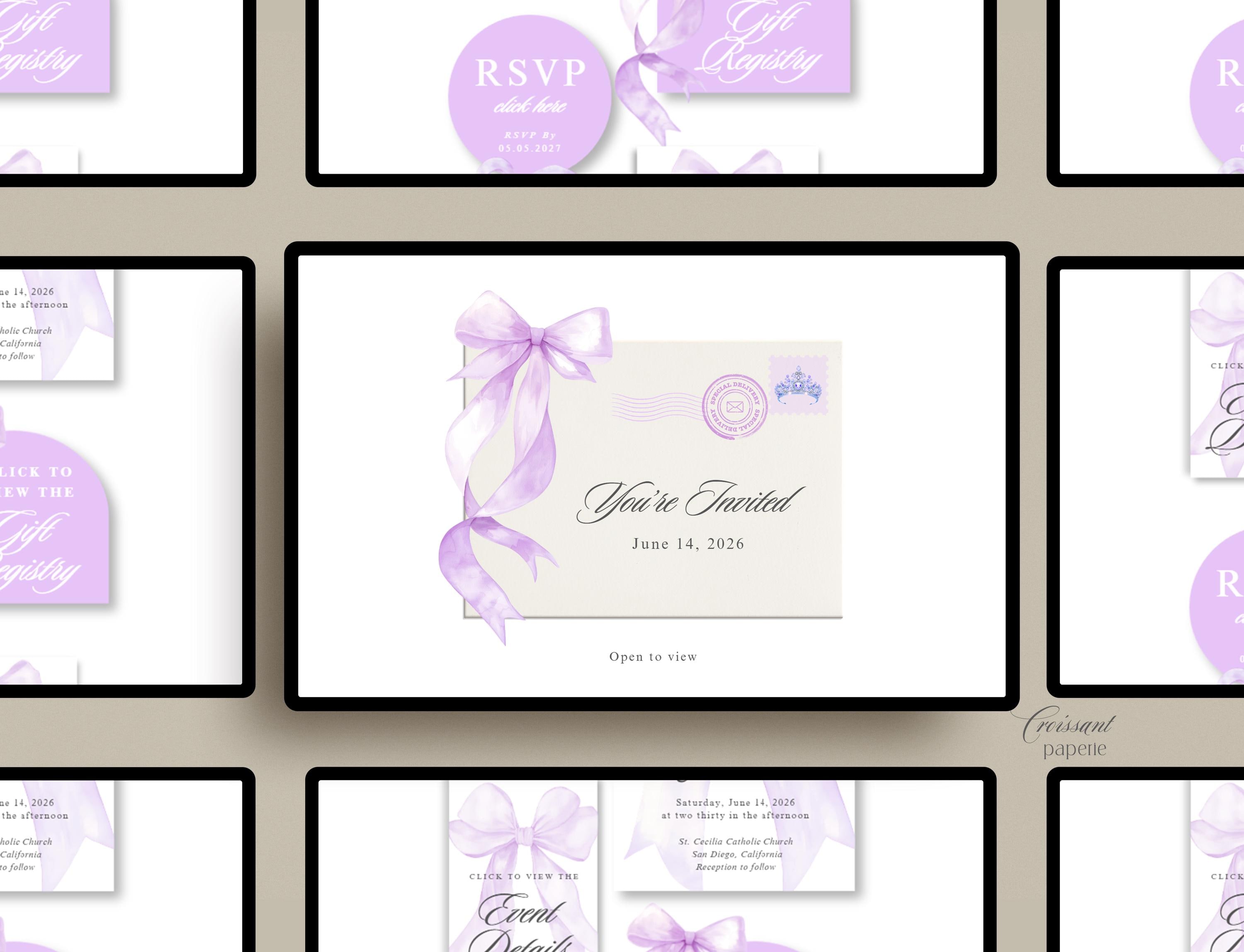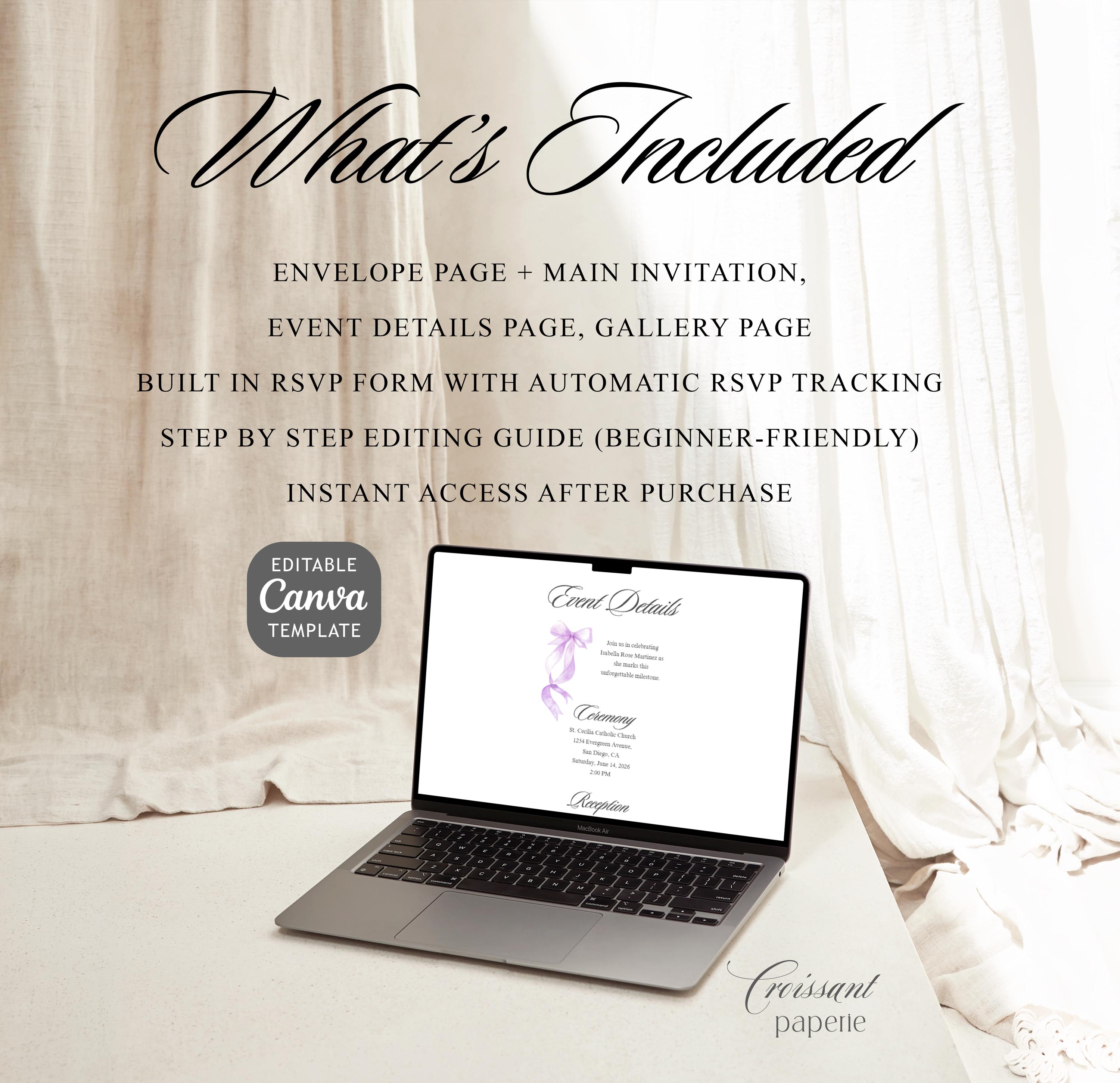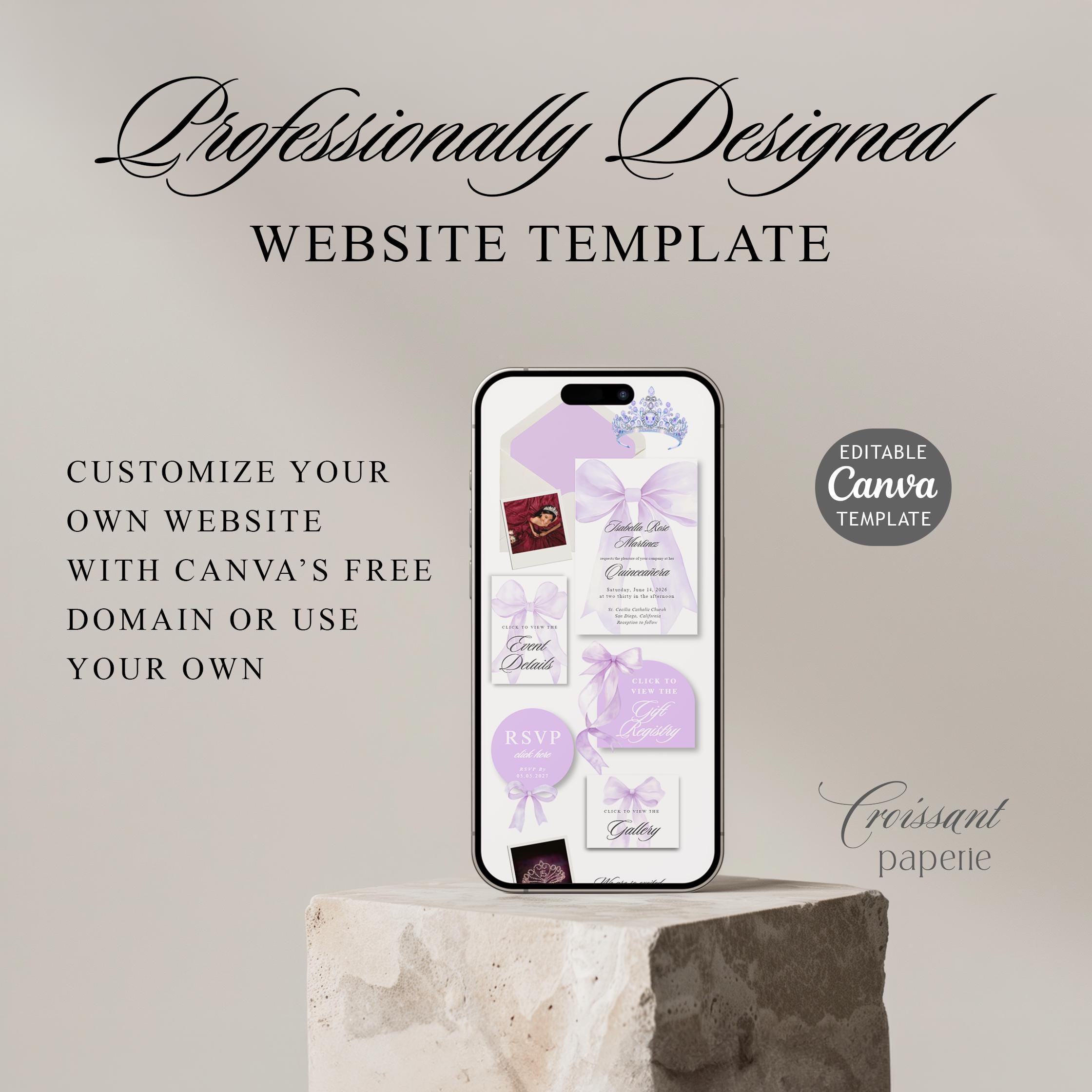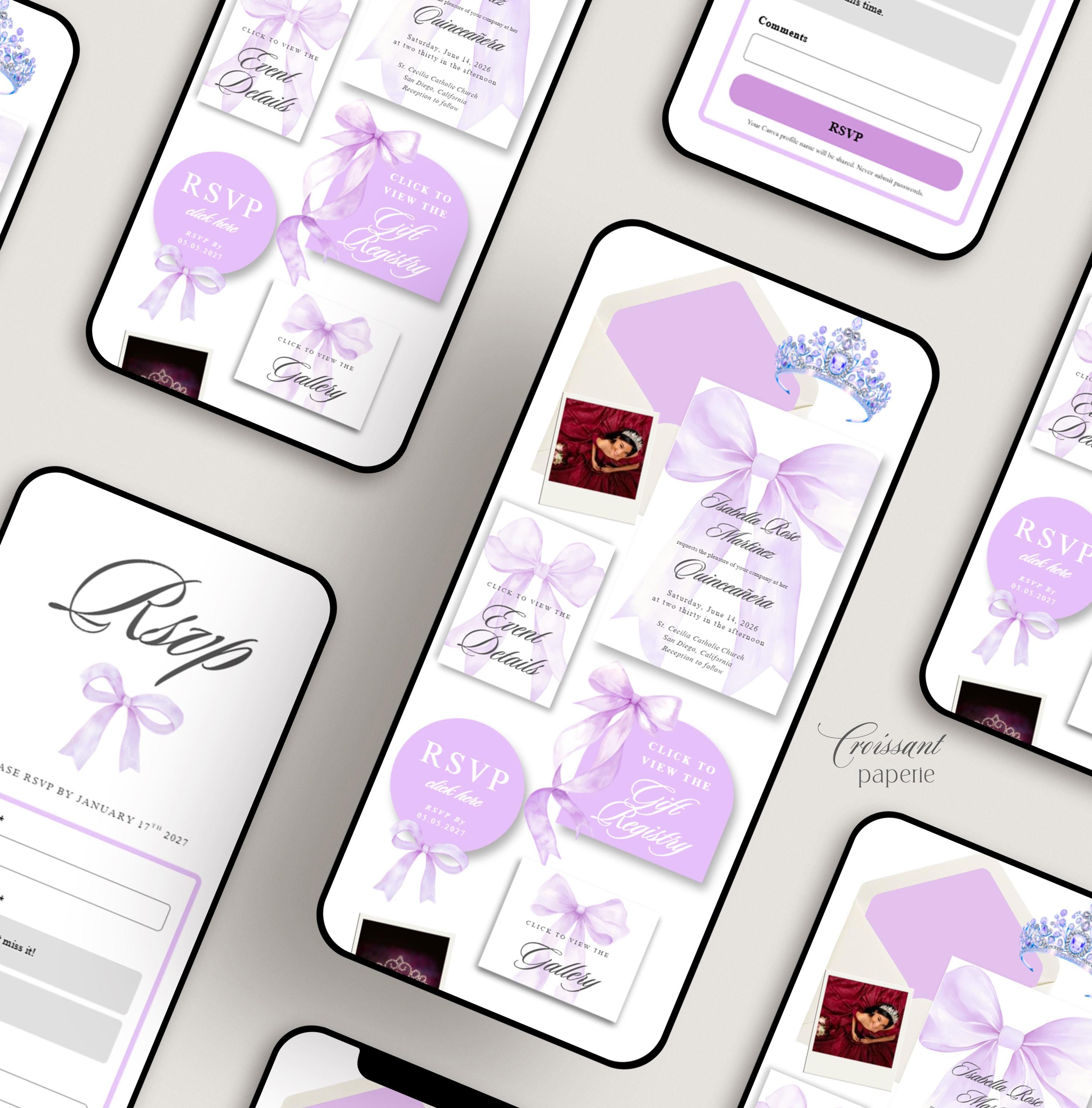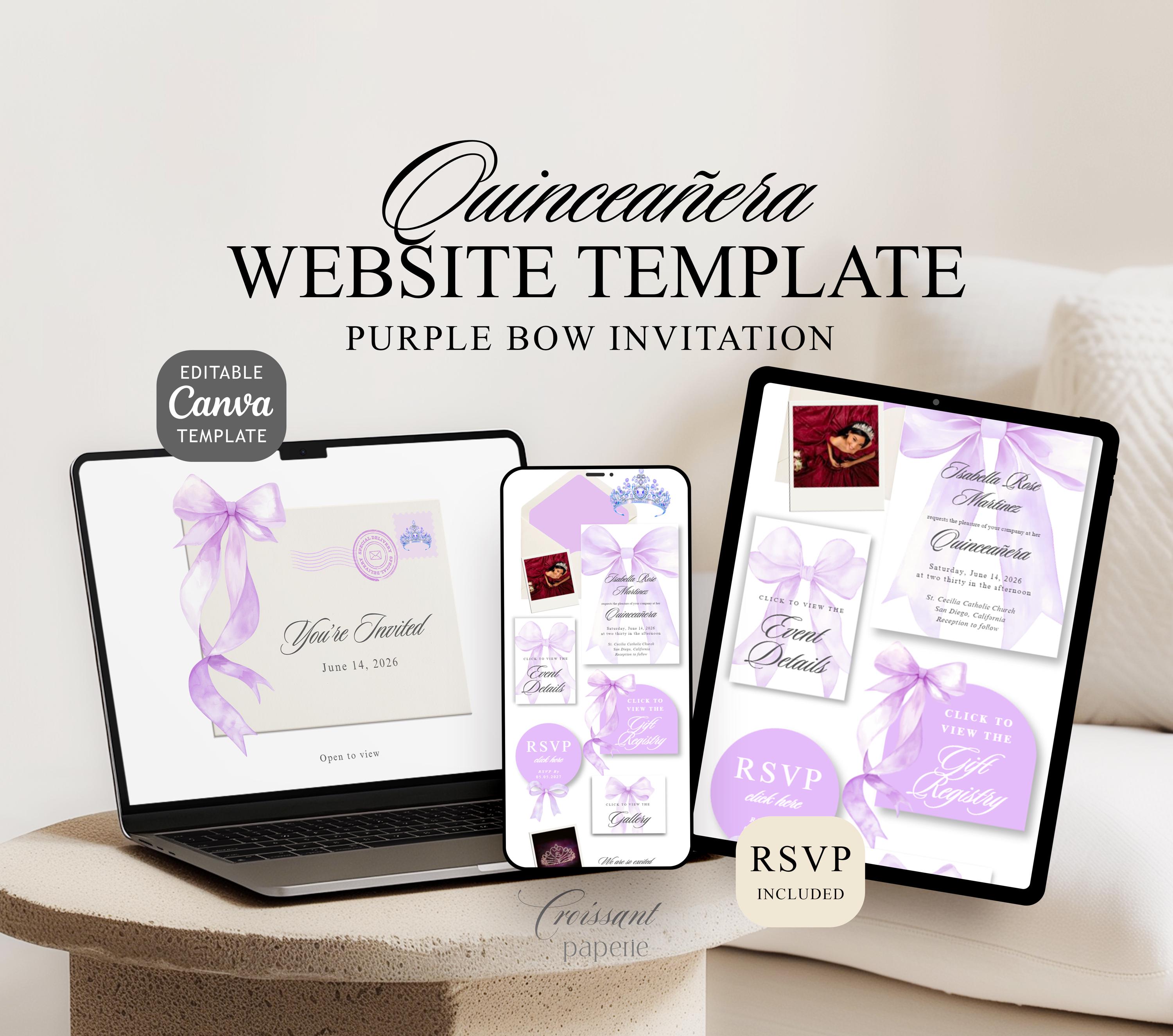 Purple Quinceanera Digital Invitation Website Template with RSVP, Editable Canva Website, Lilac Bow 15th Birthday Digital Invite quince años